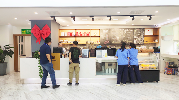 开能员工及外部客人可以在开能健康的咖啡吧,享受咖啡与各式绿色健康饮品、水果、面包糕点等,开能咖啡吧的食品及原材料都是经过精心挑选,保证健康、绿色、营养,用丰富多样的饮品、水果、零食让开能员工的园区生活充满乐趣与活力。