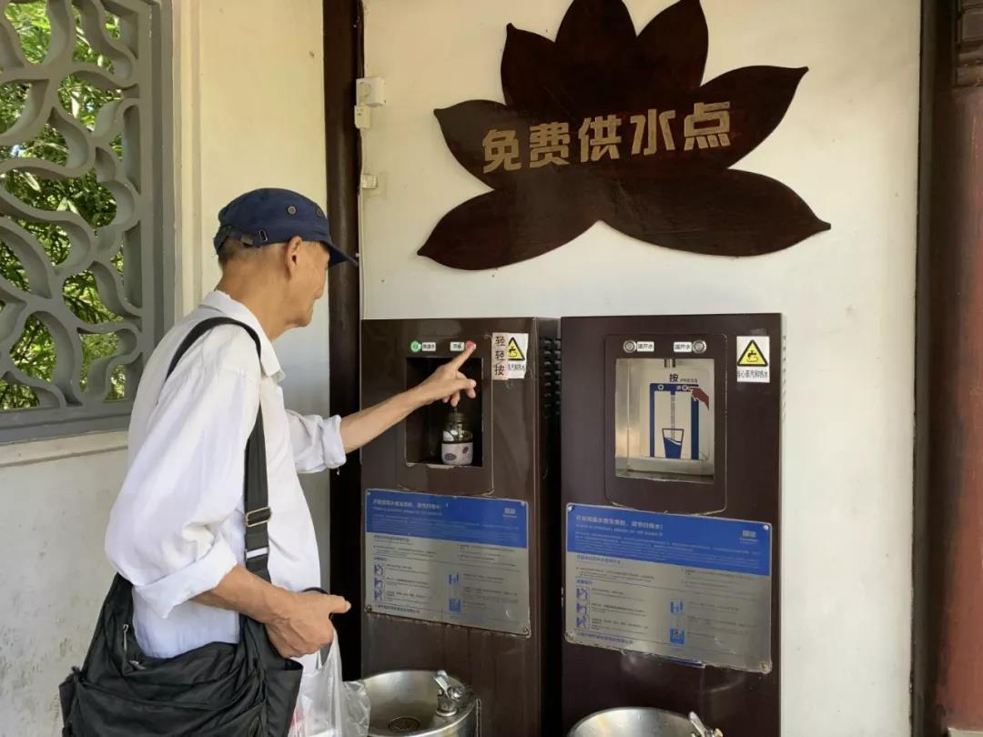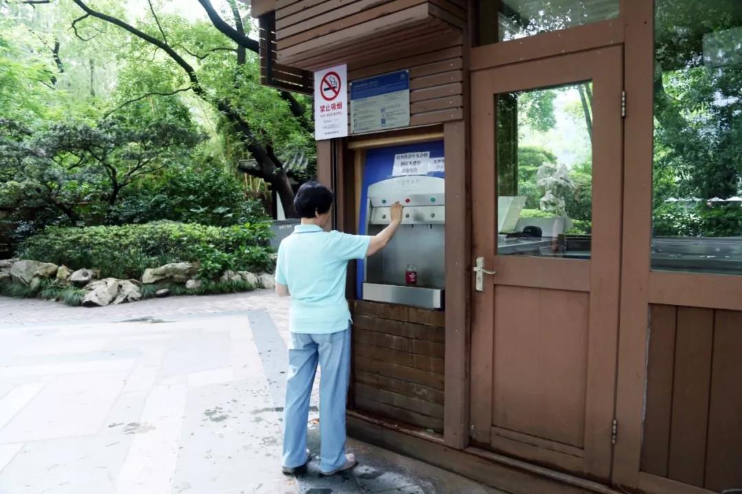 古猗园的开能公共饮水点,位于园区检票入口边的长廊上,设有直饮台和接水口,能够满足不同方式饮水。