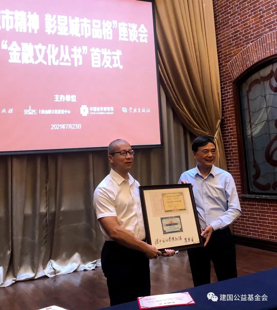 瞿建国向中国证券博物馆捐赠“老八股”之一申华电工原始股股票样张。中国证券博物馆为瞿建国颁发了捐赠证书。