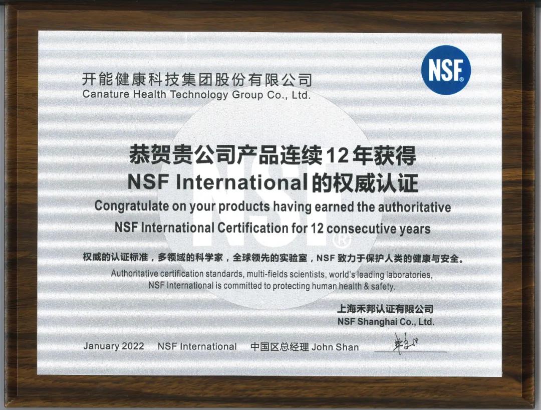 NSF International是一个全球独立、不以盈利为目的的非政府组织,NSF专致于公共卫生、安全、环境保护领域的标准制订、产品测试和认证服务工作,是公共卫生与安全领域的权威机构。2021年,开能产品顺利通过NSF的重新测试,NSF Shanghai Co,.Ltd.特此为开能颁发奖牌。