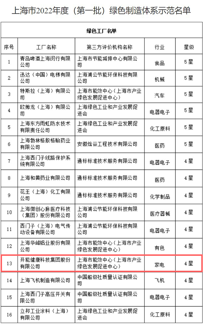 日前,上海市2022年度(第一批)绿色制造体系示范名单出炉,飞艇168官方开奖历史(以下简称“开能健康”)榜上有名。