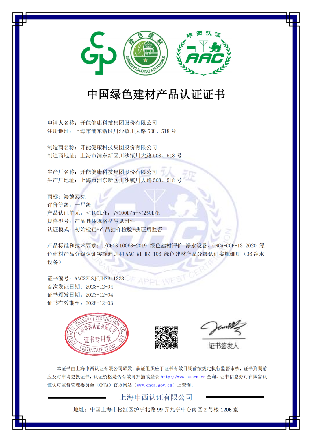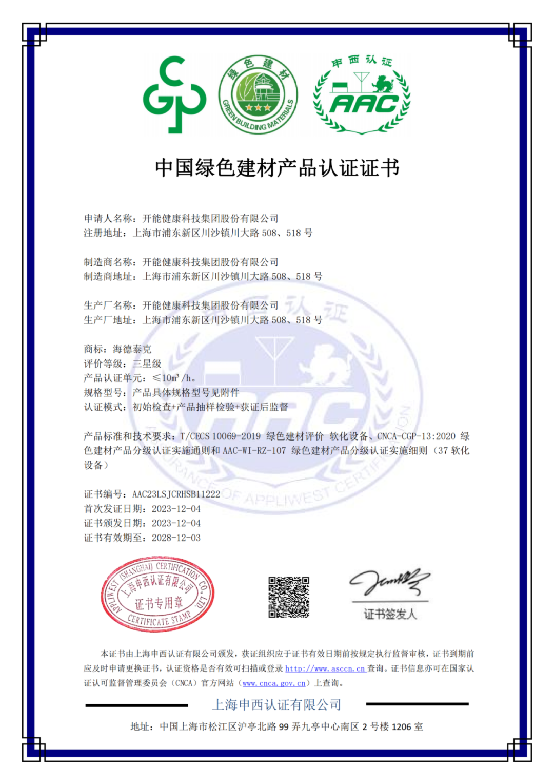 开能健康一直以来都秉持着“绿色、环保、健康”的理念,助力建材行业绿色发展,经过认证中心专家组的严格评审,审核范围涵盖产品品质、管理体系、厂区环境、研发设计、生产管理、工艺技术等多方面内容,对原料供应、生产制造、产品性能、能耗及发展方面等展开层层筛查,顺利通过并获得中国绿色建材产品认证证书。其中开能生产的软水机产品获得三星级“中国绿色建材产品认证证书”,该级别是“中国绿色建材产品”分级认证中的最高等级。