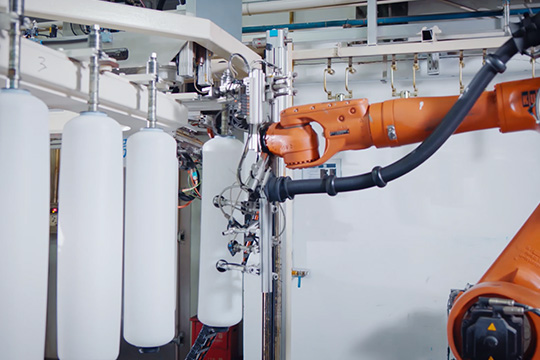这是世界为数不多的定制化自动生产设备,从塑料原料到复合材料压力容器,全部自动化生产,达到高质、高量生产水平。